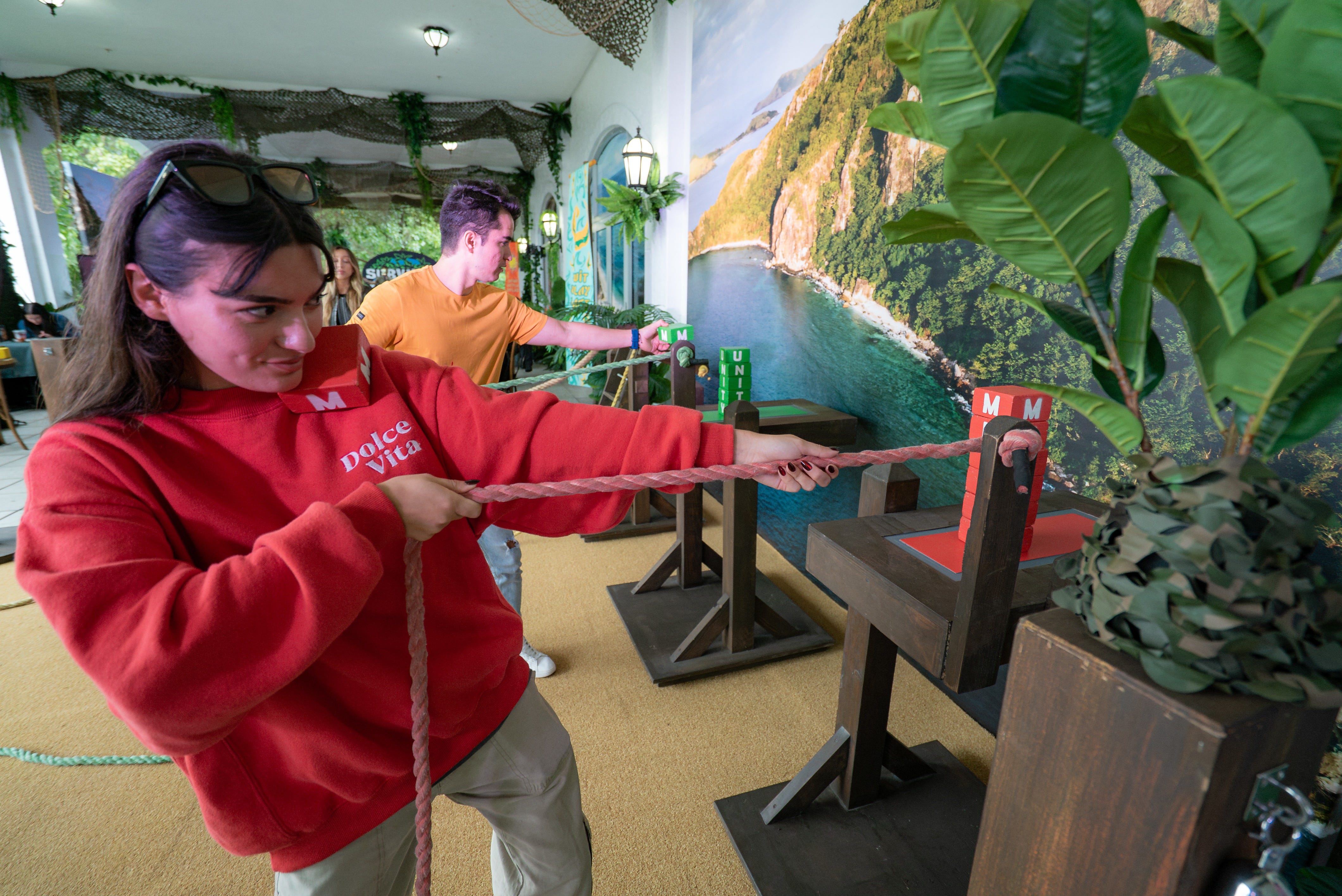 The space: Looks about as close to a castaway island as you can get on the third floor of an administrative building. The event space is done up in tropical foliage and cargo nets, with a smattering of tables set on the balcony near the immunity challenges, and inside near the Tiki Bar. There’s plenty of Jeff Probst cutouts, scenic island backdrops, and photo ops with scenes from the show. The tiki bar inside is probably the highlight, filled with fruity, oversized shareable drinks. Prop tip: Split one with a friend, then head over to the voting confessional. Someone’s leaving in tears.
