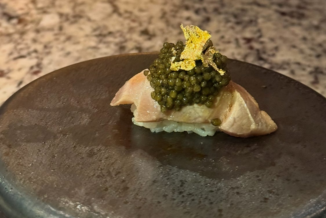 An Omakase joint where over 90 percent of the fish is imported from Japan, the Chef collective composed of Ronnie and Soren was a major part of the excellence as these personality loaded wizards were serving us in style. From the Soba green tea noodles with apple, to the cucumber and julienned with sesame ponzu, Bluefin Tuna, Japanese Sea Bream, Hamachi, Shima-Aji, Golden Eye Snapper, O Toro, Spanish Mackerel, Seare…