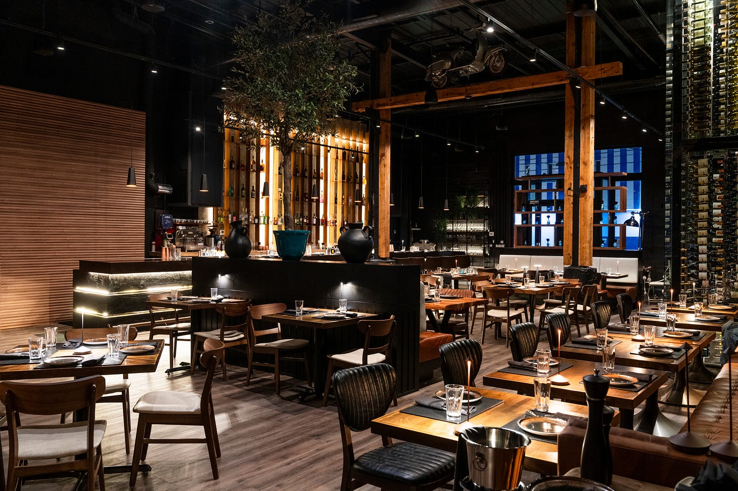 The space: You might remember from its previous lives as other flame-inspired spots Log , Shelter, and Made in Italy. Martucci has thankfully removed the animal heads from the wall and the piles of logs from the dining room, creating a tall, dark, sexy space with an open kitchen and a wood burning oven. Large leather booths line the outside with glass wine bottle walls separating the main room. Its convivial, though the two-tops are just close enough that you can hear the people next to you chewing.