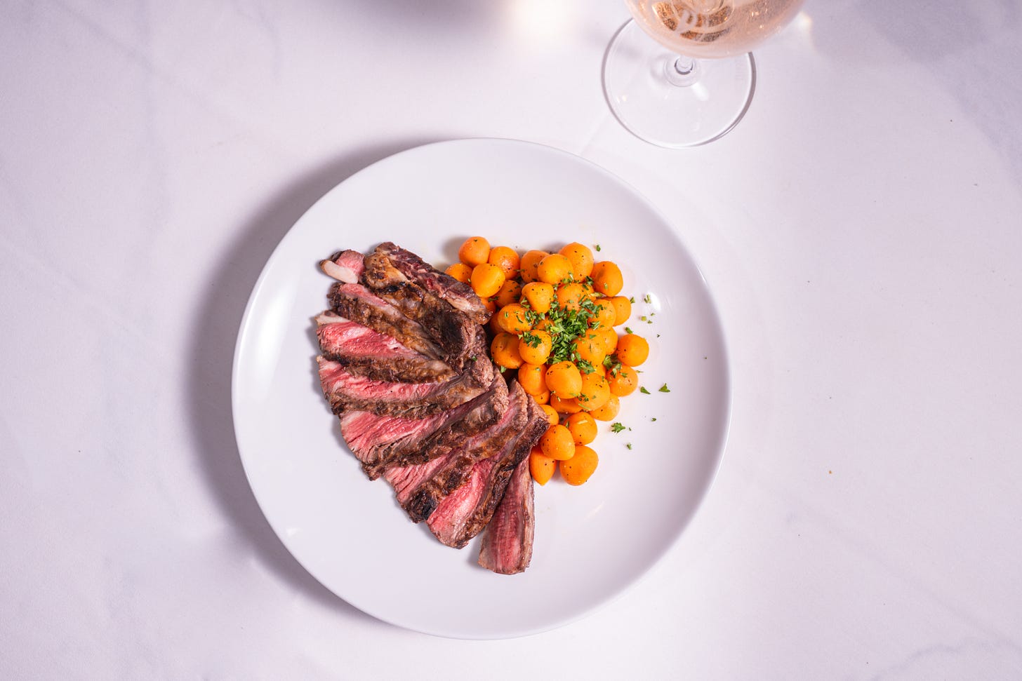 What to eat and drink: The baguettes are fantastic, and if you order them with the trio of truffle, beet, and orange hummus you’ll ruin your main course like you ordered the chips and salsa at Chili’s. Assuming you show some self control during the bread course, the beef and truffle carpaccio is light, and doesn’t murder the meat with truffle. The steak frites is a juicy ribeye cooked a perfect medium rare that’ll have you rethinking kosher meat. If that’s too heavy, the endive and “bleu cheese” salad is a fun way to try Ostrow’s dairy-free dairy.